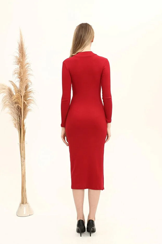 Kadın Bordo Renkli Yarım Balıkçı Tek Taraf Yırtmaçlı Elbise